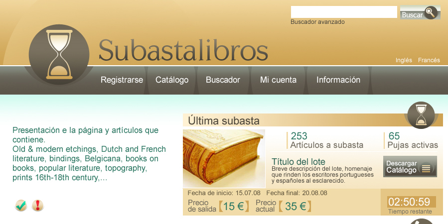Portal de subastas de lotes de artículos, con una descripción detallada de fecha y precio de salida y siempre el actual, con un reloj cronómetro que indica el tiempo restante. Visible el número de pujas y de artículos activos en cada momento.